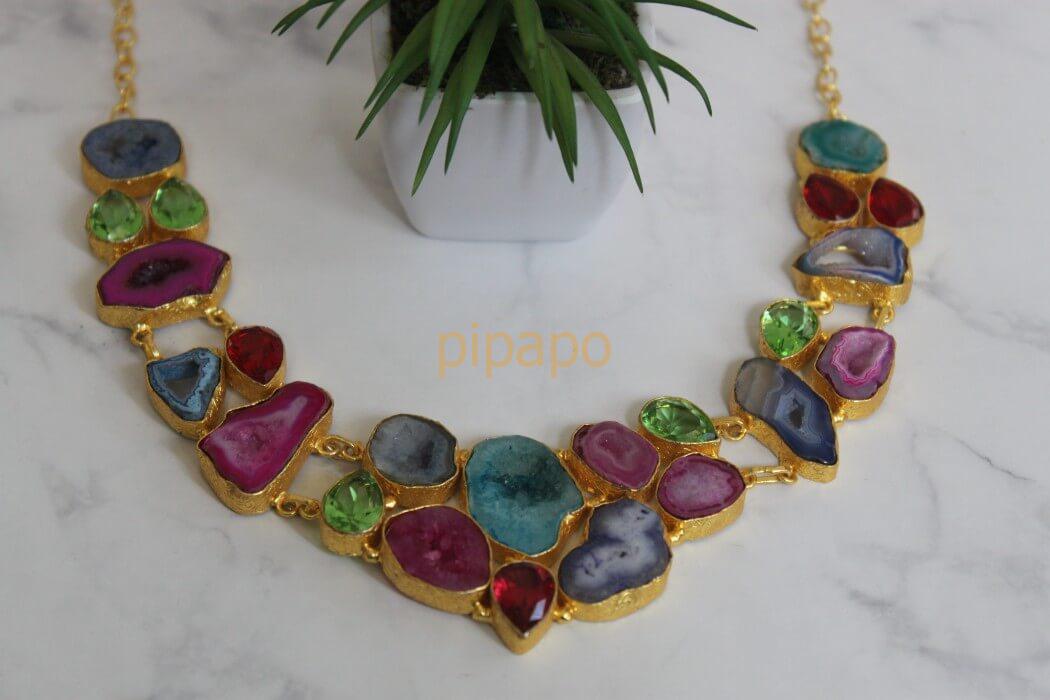 It's a colorful statement piece. Try it! Wear it! Flaunt it! These incomplete druzy stones which look like geodes completely fills up your neck.