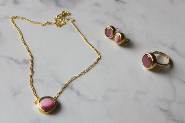Dress up with Pink! This classic pink set comes along with earrings, chain and ring.