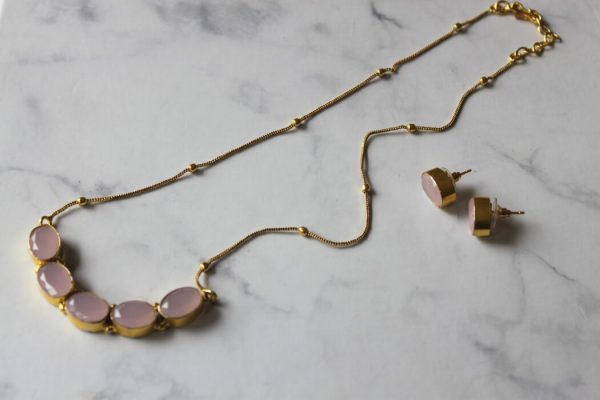 This curved 5 pink stone beauty fits the neck perfectly. This comes along with a pair of pink stone earrings.