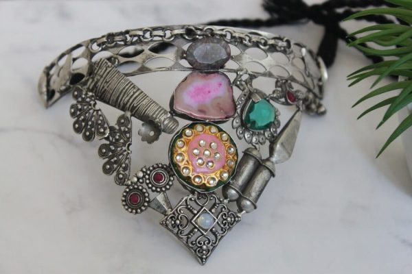 - Material- Brass in oxidised silver with kundan, glass and druzy stones.
