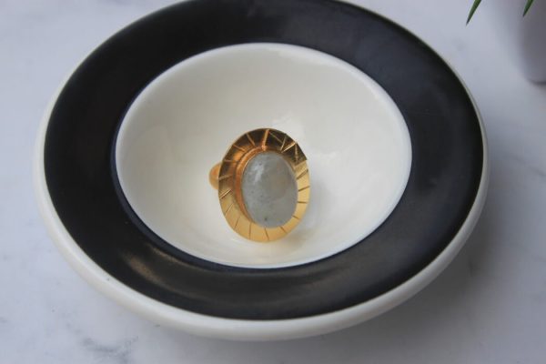 This is a white moonstone ring. The single oval big moonstone with a rim of carved lines is a simple elegant design made with love.