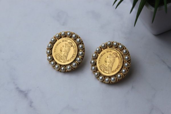 The modern design of this big victorian coin studs is what makes this pair of earrings so attractive with surrounding of tiny pearls.