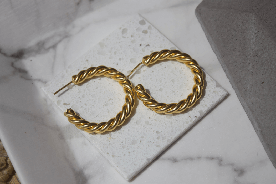 The Twisted rope Gold earrings are thick and medium in size, Dress it up with literally any pair of your clothing. Material – Micron Gold Plated Size – 1.5 inch diameter Weight – 25 gms