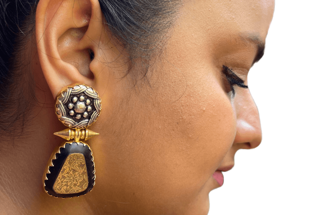 Mix tones combined with wood. Some pieces of jewelry you see and you love, this is one of the jewelleries liked by most. The wood painted black with gold and silver is a classic and a rustic elegance.